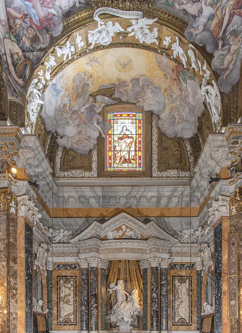 Detail. Gian Lorenzo Bernini, The Ecstasy of St. Teresa, 1647-52. Marble (20 different kinds!), bronze, fresco, stucco, stained glass . . . Cornaro Chapel, Santa Maria della Vittoria, Rome, Italy.