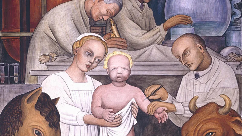 Vaccination/Nativity scene featuring Dr. William Valentiner (Detail) North Wall, Detroit Industry Murals, fresco, 1932-33.